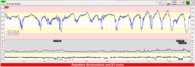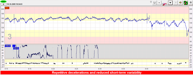 The simultaneous appearance of repetitive decelerations and low variability suggests some hypoxic risk, and a lower threshold for intervention in probably appropriate in these situations.