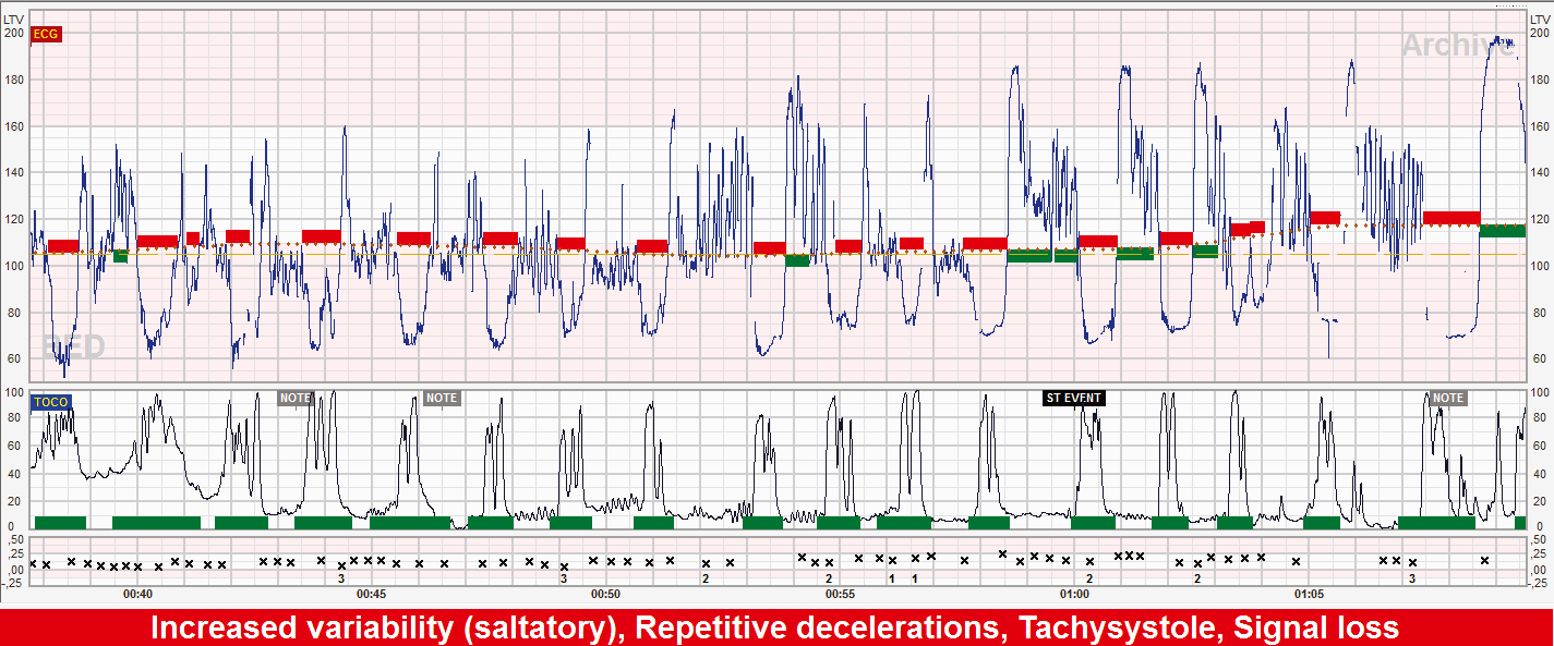The “Excessive uterine contractions” alert should motivate the evaluation of an eventual oxytocin induction/augmentation of labour and suggests careful monitoring for the appearance of hypoxemia-related changes in the fetal heart rate.